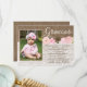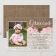 A Bautizo or Primera Comunión thank you card with burlap and lace effect background with pink watercolor flowers and space for your little girl's photo.