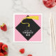 Creative graduation party napkins for class of 26 grads featuring funny line and classic black graduation cap with gold tassel on pink background.