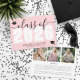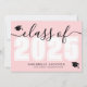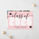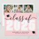 A classic yet modern horizontal graduation announcement. The front features an oversized "Class of 2026" in bold black and white, with the year in crisp white against a blush pink background. Elegant black script accents and two black graduation cap icons add a celebratory touch, with space below for the graduate's name and school. Colours can be customised to match school colours for a personalised look.