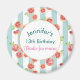 A birthday magnet featuring a digital image with a repeating pattern of pink grapefruits created with watercolors, set on a pastel green and white striped pattern. A white circle with a gold border holds your customised text.