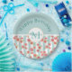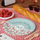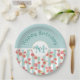 Happy Birthday paper plates with a repeating digital pattern of pink grapefruits created with watercolors, set on a pastel green and white striped pattern. The top portion of the item has a pastel green background. A white circle with a gold coloured border sits in the centre and holds your personalised name and monogram initial.