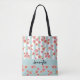 Personalised tote bag featuring a digital image with a repeating pattern of pink grapefruits created with watercolors, set on a pastel green and white striped pattern. A green border stretches across the bag with your personalised name inside. The bottom of the bag has more grapefruits on a solid green background.