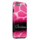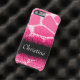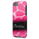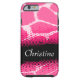 Bright bold animal patterned case in black and pink hues. Personalise this item with your first name. This example currently reads: Christine. This original pattern by Sarah Trett, is based on the patterning found on a giraffe with a halftone moiré dot gain pattern overlay.