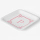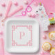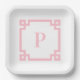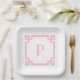 Decorative white and pink Greek key style square border and modern serif monogram on a square paper plate.
