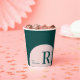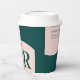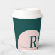 This modern coffee paper cup features a simple initial with stylish colour blocks( Pink & Teal Green). Add your marketing information to this custom cup. You can use this personalised cup at your business place, shops, company event or, etc.