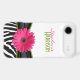 You can personalise the name on this chic black, white, pink, and green zebra print and gerbera daisy customisable iPhone case. Fun and cheerful featuring a black and white zebra print design and a pretty hot pink gerber daisy flower. This girly design makes a great gift for her. To personalise the name, use the personalise tools. For more extensive changes (font, font colour, font size, text placement), use "customise it".