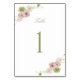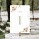 Elegant romantic wedding table number card, adorned with a stunning soft pink and green watercolor floral design and classic calligraphy.