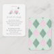 This smart baby shower insert card design features a hand painted watercolor pink golf card with green balloon and a preppy pink and green diamond pattern (argyle) backer. Shown here as a Books For Baby request but all of the text can be customised to your event needs.