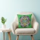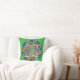 An intricately hand-drawn pink and green lotus mandala on a throw pillow.