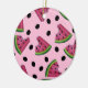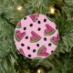 Ornament features an original marker illustration of a slice of juicy pink watermelon and watermelon seeds, on a pink background.
