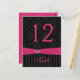 This dramatic hot pink, dark charcoal grey and black damask with a striped pattern wedding table number postcard has a PRINTED hot pink ribbon with a PRINTED diamond jewels buckle on it that matches the wedding invitation shown below. ****PLEASE NOTE that you MUST change the number 12 to each of the numbers that you need, add it to your cart, and then return and repeat the process until you have all the individual numbers you need. Quantity discounts will apply as you add cards to your cart. ***PLEASE NOTE that if you change the font or size of the font, it may alter how your card prints. It will print the way you see it on your monitor, so if you have alignment issues, or sizing problems, please contact me for help. I will not see your card once you order it, and Zazzle will NOT edit anything (typos, alignment, etc.). If you require assistance or would like any other matching items, please email your request to niteowlstudio@gmail.com.