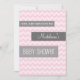 Personalised baby shower invitations in elegant and modern light pastel blush baby pink, dark charcoal grey and white vintage retro chevron zigzags stripes pattern. Customisable with your text, contact us to request a colour change.