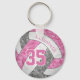 This personalised girls' volleyball keychain features a pink, grey and white volleyball graphic that has a girly floral kaleidoscopic pattern blended with the pink and grey volleyball panels and an abstract swirl pattern blended with the white panels - her name and jersey number are customisable in coordinating pink - by katz_d_zynes | see more custom volleyball team colours keychains in katzdzynes' Volleyball keychains collection >>> https://www.zazzle.com/collections/119042498553482541