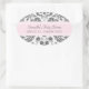 Baby shower thank you favour tag sticker in elegant light blush pink, grey and white classic floral damask pattern. Customisable with your own text, contact us for a colour change. The perfect way to decorate your baby shower favours and thank your guests for being a part of your special day.