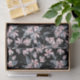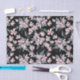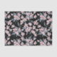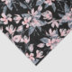 Tissue paper with an elegant pattern made with a watercolor illustration of pink flowers with blue-grey leaves and stems. Classy black background.
