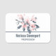 A name tag with a pretty watercolor illustration of pink flowers with grey leaves on a single stem. A modern elegant botanical design.