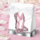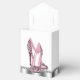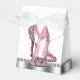 Beautiful black and pink glitter high heel shoe party favour boxes. These elegant pink glitter high heel shoe favour boxes can be customised with text and you can change the background colour and bow colour.