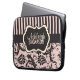 This personalised blush pink, charcoal grey. and ivory floral damask and stripes laptop sleeve has text boxes for you to customise with your own name, initials, business name, or other text. If you need any help customising, please email niteowlstudio@gmail.com.