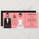 Fun Jack and Jill wedding shower party ticket features a silhouette of a groom in a black tuxedo. There is also a silhouette of a bride in a white wedding gown. The faces of the bride and groom are missing and instead have the text Jack and Jill over each, respectively. There is a place to add the grooms name in pink font in his tuxedo and the brides name in black font in her wedding gown area. There is customisable text to add the date and time. To the right hand side of the groom and bride design is a black dotted line so that the invitation can be used as ticket style and cut off as the paid stub for entrance into the Jack and Jill wedding shower. There is customisable text in black font in the stub area where you can add the entrance fee, address, time, etc. This a fun and unique Jack and Jill Wedding Party Shower ticket!