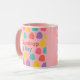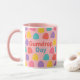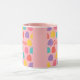 This mug features a pink gumdrop candy cute comic image. The image shows many cute gumdrops on a pink background. The words Gumdrop Day are in text centered on the image. This picture is a cute holiday image for Gumdrop Day which is celebrated on February 15th every year. The image is on both sides of the mug. The mug is a pink and white combo mug. The mug has a pink handle and a pink glaze interior. The mug is an eleven ounce mug.
