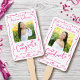 Stay cool while supporting your favorite grad as they receive their diploma with this quirky, whimsical, simple, modern keepsake 2 photo hand fan. Fun hot pink handwritten script typography and hand drawn graduation icon sketch doodles overlay a clean, minimalist white background. The copy “congrats” and photo 1 are on the front, the word “graduate” and photo 2 are on the back. Personalize the custom text with your graduate’s name, school and class year. Matching invites, thank you cards, stickers, banners, yard signs and other graduation goodies are also available in this trendy and playful collection. Guaranteed to preserve cherished memories of their special occasion!