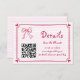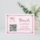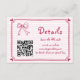 Pink and white Hand drawn scribble whimsical retro French Parisian style wedding enclosure card. This enclosure card showcases a charming and playful design, highlighted by a hand-drawn illustration of a bow in magenta that exudes whimsy. It includes whimsical frame with hearts, a bow and the text "Details". There also is a pink and white striped pattern an a QR code for guests to scan for details.