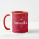 A handwritten, personalised name of your choice is set against a playful background of tiny foil pink hearts and dots on red glitter. Spread love and joy whenever you drink out of this colourful, stylish and modern custom name coffee mug. This is a great gift for Valentine’s Day, birthdays, anniversaries, engagements, or for an anytime “I love you” gift. Send this to someone special!