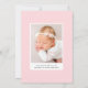Modern birth announcement card featuring "Hello Baby" in a black signature script with your baby's name, birth stats, and photo displayed below on a pink background. The photo birth announcement card reverses to display an additional photo and personal message with a pink and white polka dot background.