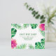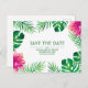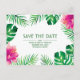 Save the Date postcard featuring tropical leaves and pink hibiscus flowers on black. Personalise this design by changing the text, text colour, and background colour. You can even add text on the reverse.