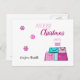 A modern playful design featuring shades of lots of pink. Numerous shopping bags with a take out pink coffee cup on top. The greeting says 'Merry Christmas'.