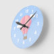 A clock with the illustration of a hot air balloon in pink stripes flying in the sky with white clouds surrounding it. For anyone who loves to travel.