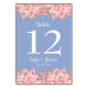 This wedding table number card features a photo of beautiful pink hydrangeas. Serenity blue is the background colour featuring customisable text on both sides for the table number, bride & groom's names and wedding date.