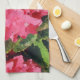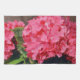 The original photograph by MaeFlowers on this Kitchen towel is a closeup of pink hydrangeas and their jagged edged spring green leaves. The central pompom of flower petals almost fills the photo, surrounded by the green leaves and bits of other flower pompoms on each side.