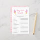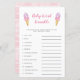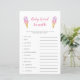 Cute ice cream theme girl's baby shower baby word scramble card featuring watercolor illustration of pink and purple ice cream on a waffle cone. The list of words on this card are all related to babies and they are scrambled. The guests are going to compete who can unscramble all of them first! ANSWER KEY: 1. car seat 2. milk 3. playpen 4. pacifier 5. diaper 6. rocking chair 7. nursery 8. baby monitor 9. swaddle 10. formula 11. rubber ducky 12. stroller.