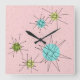 This Pink Iconic Atomic Starbursts Square Acrylic Wall Clock pattern features iconic atomic starbursts. That’s right! The old school, First Lady Pink coloured background with gold speckles is the perfect backdrop for the vibrant turquoise, soothing celery, and kitschy pear green coloured circles. The spots of colour are sporadically placed in various sizes with overlaying black V shaped lines to form the mod sputnik starbursts. Styled after a 1950’s dish pattern, this retro inspired design has everything you need to be truly mid century modern.