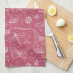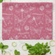 This nature kitchen towel features an array of hand-drawn creatures including butterflies, bees, ladybugs, grasshoppers, dragonflies, caterpillars, worms and flies with the hand-written text "love bug" scattered about. Illustrated in white against a pink background.