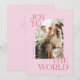 Send your family Christmas greetings with this pink, modern, elevated and chic religious Christmas card featuring the words, "Joy to the World", paired with a curved edge photo frame. The back of the card also has space to enter your own message.
