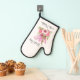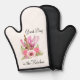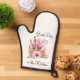 Pink flowers and pink kitchen utensils design on oven mitt and pot holder. Customise the words.