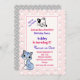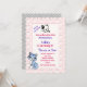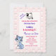 A birthday party invitation with a background pattern of sleeping kitty cats with their eyes closed. A waving kitty cat at the top and a pretty blue cat along the side.