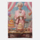 Whimsical old chic lady in a pink striped ensemble and matching curtains celebrating her birthday