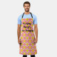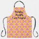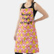 This apron has a geometric design of repeating pink and orange triangles with yellow circles on top on a field of off-white. Want the same design in different colours? Message me.