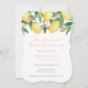 Fresh watercolor lemons and glossy green leaves with a striped reverse for this elegant modern birthday party invitation.