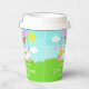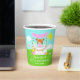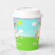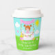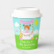 This cute and whimsical paper cup features a red hair girl with fair skin at a pink lemonade stand which is decorated with flowers and bunting. In the background is a blue sky, sunshine and butterflies. The text combines decorative and sans serif fonts for a stylish and modern look. This is perfect for a summer birthday party.