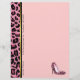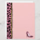 Whimsical and pretty personal or business letterhead stationery done in a pale muted pink, with graphics of a pink and black spotted leopard print running along the left side of the paper. A gold tone and black stripe borders the leopard print and graphics of pink leopard print stiletto heels, decorate the bottom right corner, of the stationery. Small black text runs vertical along the stripe. Personalise the text for yourself or your business.