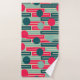 This towel set has a mid-century modern design of repeating rectangles in pink, teal, and blue with circles layered on top.