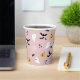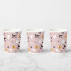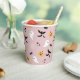 Cute paper cups featuring whimsical Halloween ghosts, pumpkins, spiderwebs and bats against a gentle blush pink backdrop.