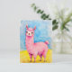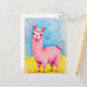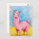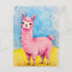 An adorable illustration of a whimsical, friendly pink llama with a blue watercolor looking sky and yellowish- green grass.