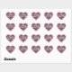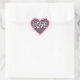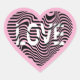 A heart shaped sticker filled with an optical illusion design of black and white stripes embracing the word LOVE on a pink background.