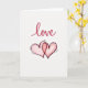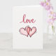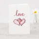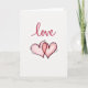 This greeting card features the word “love” written near the top in flowing red script, with visible brush-like strokes that give it a warm, handwritten feel. Below the text, two hearts sit at the center on a bright white background. Each heart has a loose dark outline that looks hand-sketched, and they are filled with soft pink watercolor. One heart overlaps the other, showing closeness and connection. Small dashed lines radiate around the hearts like a gentle glow or heartbeat, adding movement and warmth. The open space around the artwork keeps the focus on the message and symbols. Overall, this card feels tender and sincere, making it a lovely choice for sharing affection with a partner, close friend, or someone special on Valentine’s Day. ❤️💌🍫