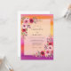 This design features a vibrant gradient of sunset hues ranging from warm orange to deep magenta. Lush watercolor bouquets of blush pink roses and deep crimson ranunculus adorn the edges. Delicate purple leaves and golden foliage add a whimsical and organic feel to the artistic backdrop. Ideal for a summer seasonal event, the palette evokes the warmth of a tropical twilight.